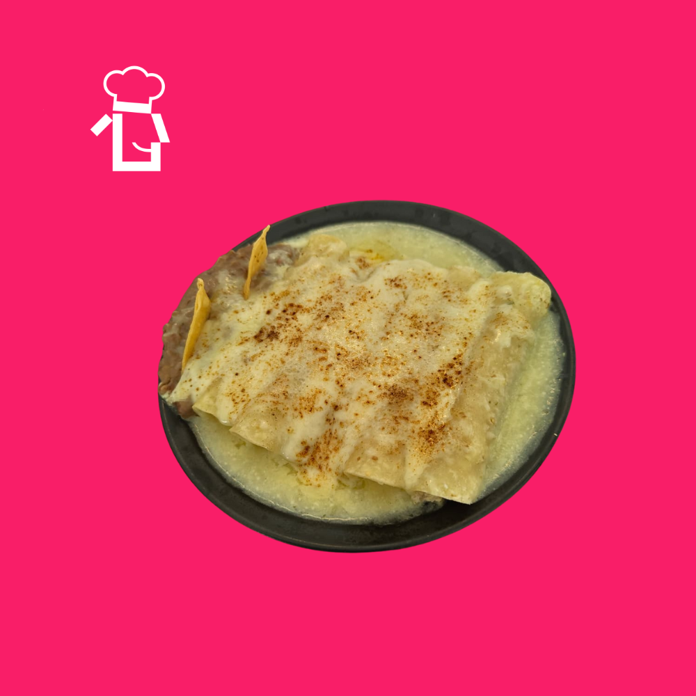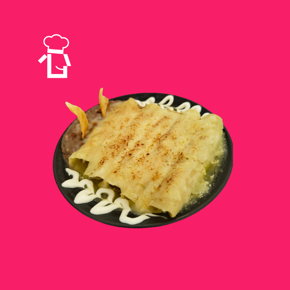 5 Enchiladas rellenas de pollo, cubiertas con salsa verde cremosa y queso gratinado.