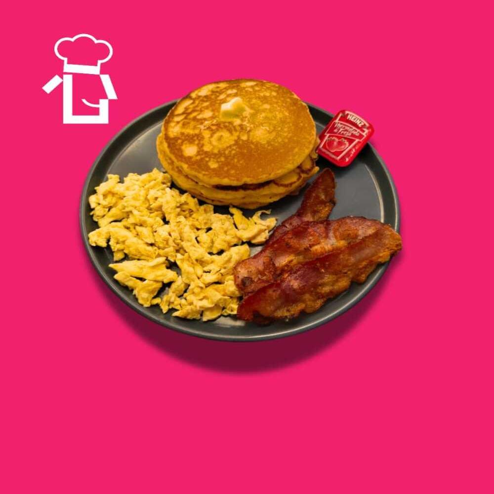 3 hot-cakes acompañados con huevo revuelto, tocino, mermelada y jarabe de maple