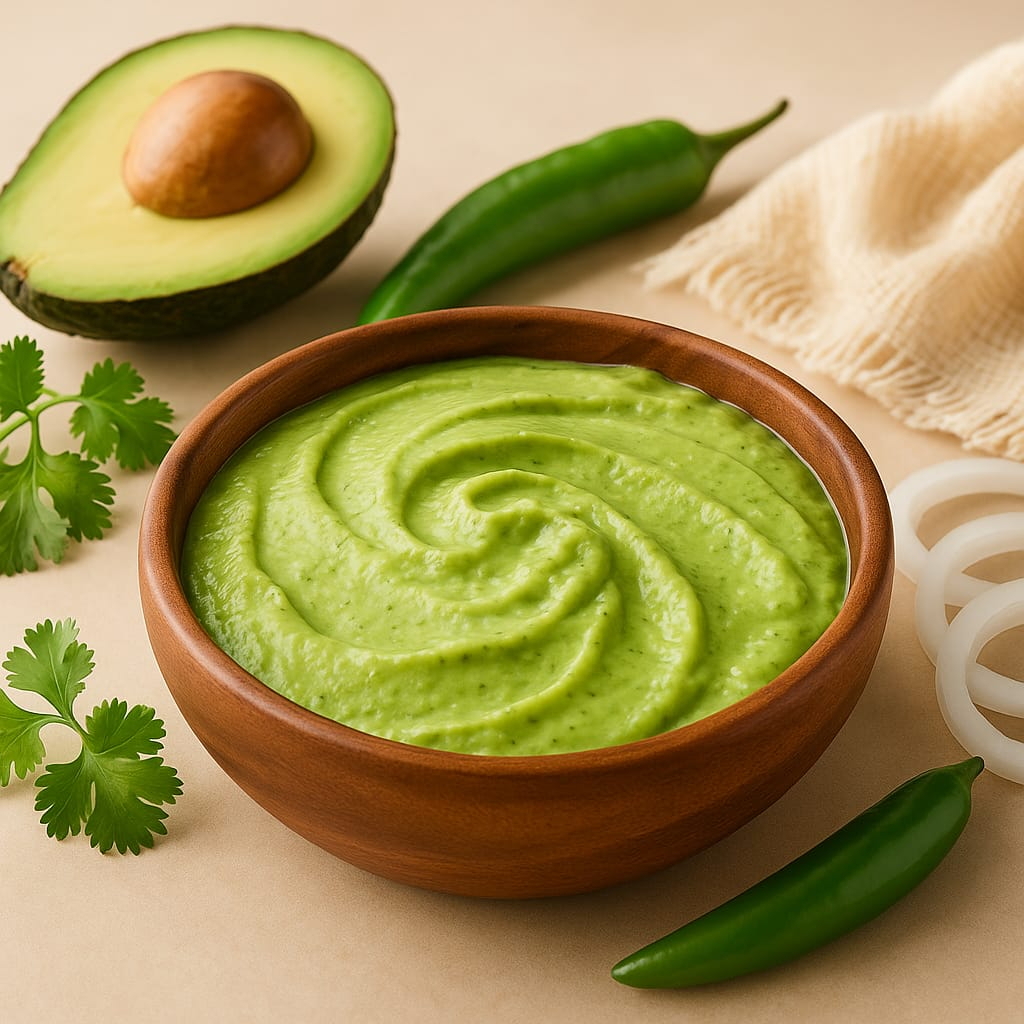 Deliciosa y cremosa salsa preparada con aguacate, cebolla y cilantro.