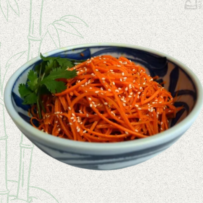 Finas tiras de zanahoria fresca salteadas rápidamente a fuego alto para resaltar su dulzor natural y mantener una textura firme y crujiente. Aliñadas con aceite de sésamo tostado.