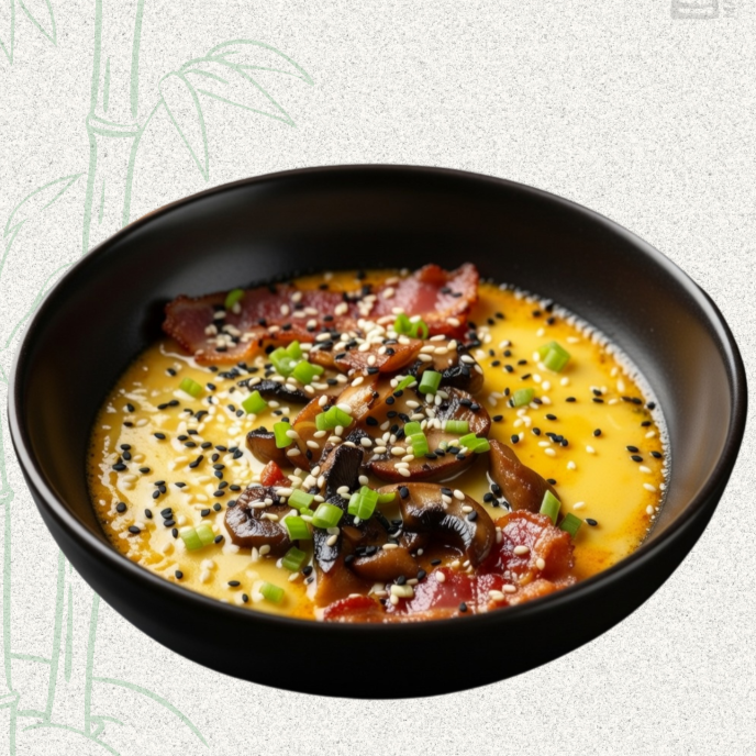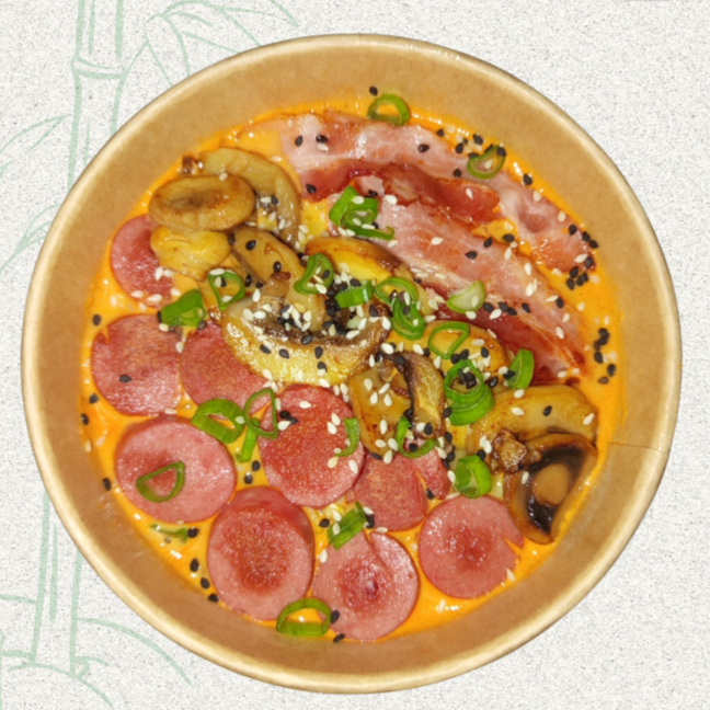 Fideos ramen elásticos bañados en una salsa aterciopelada de crema. Coronados con tocino crujiente, salchicha, champiñón, queso y cebollino fresco. Una explosión cremosa de sabor umami en cada bocado.