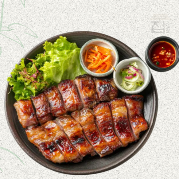 Panceta de cerdo (literalmente 'carne de tres capas') cortada en tiras gruesas y asada a la parrilla.