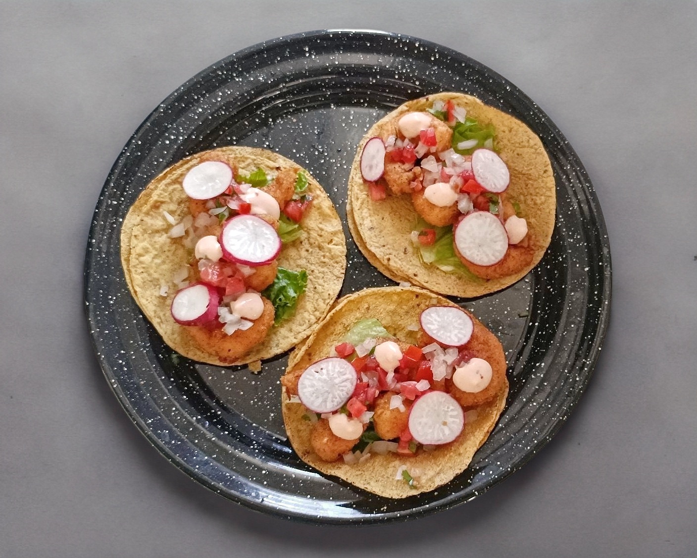 Orden de 3 tacos de camarón empanizado, acompañado de lechuga, rábano, pico de gallo y mayonesa de chiles secos.