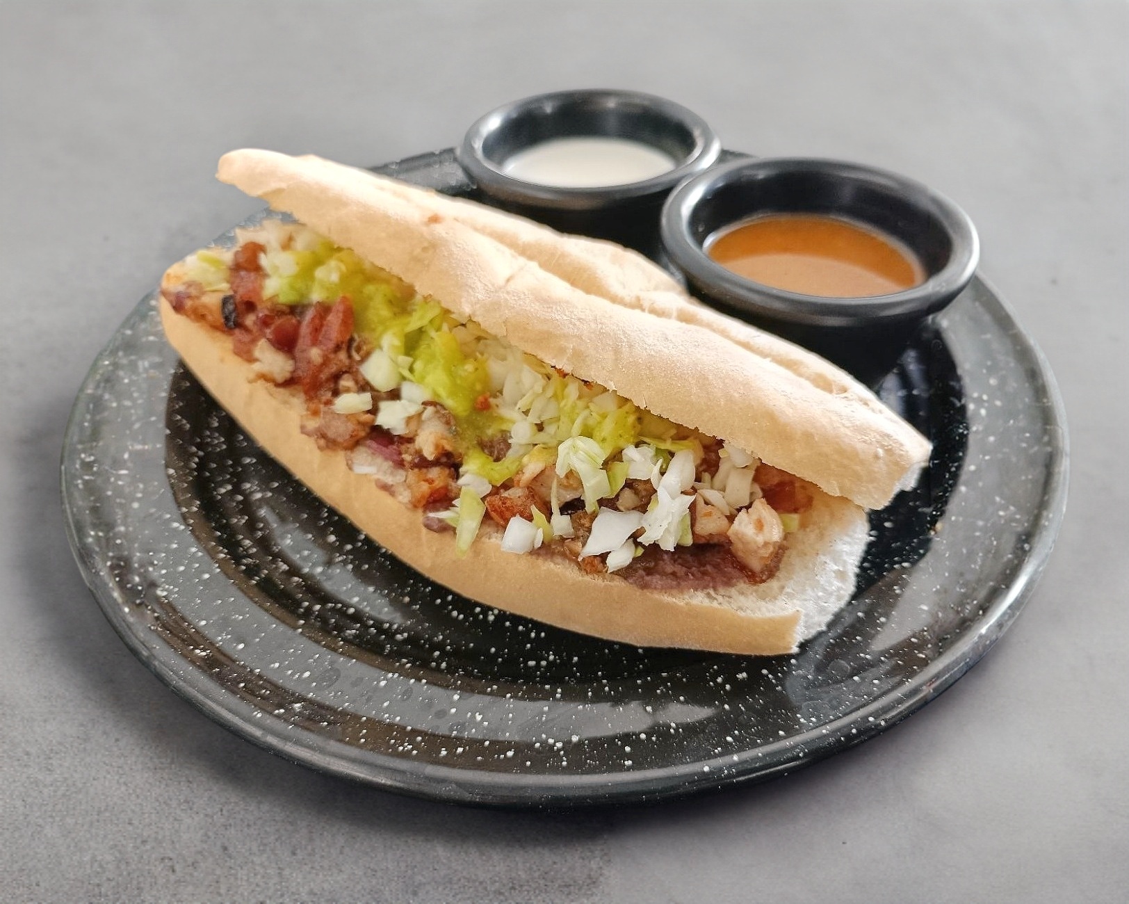 Torta de carne asada con frijol, cebolla asada, repollo y salsa de aguacate con tomate verde.