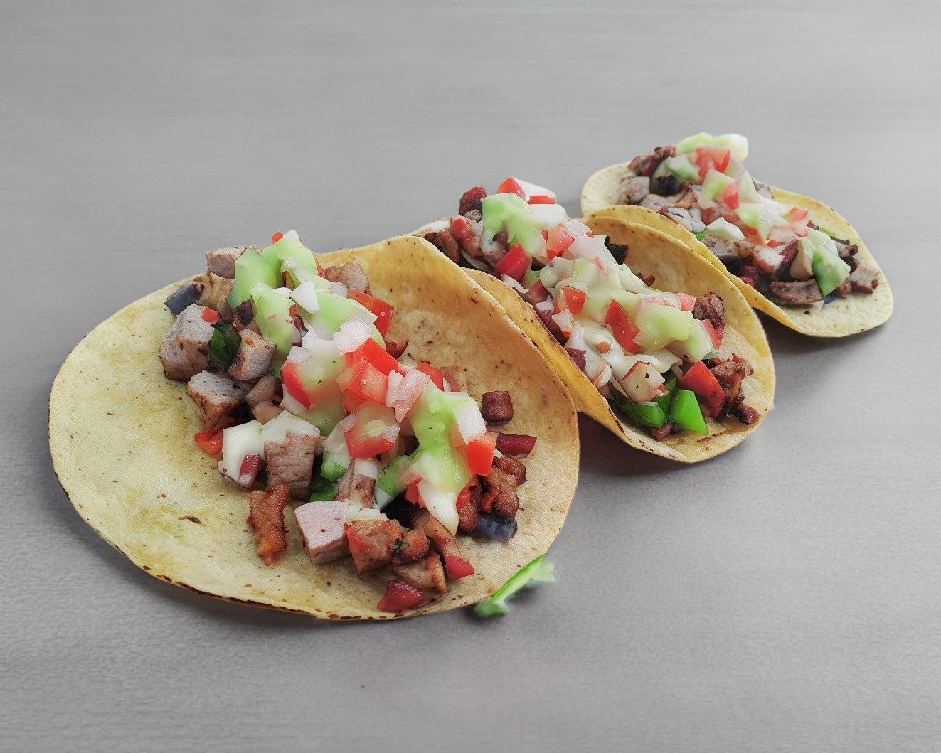 Taco de carne asada con frijol, chorizo, cebolla asada, pimiento, queso manchego gratinado y salsa guacamolada.
