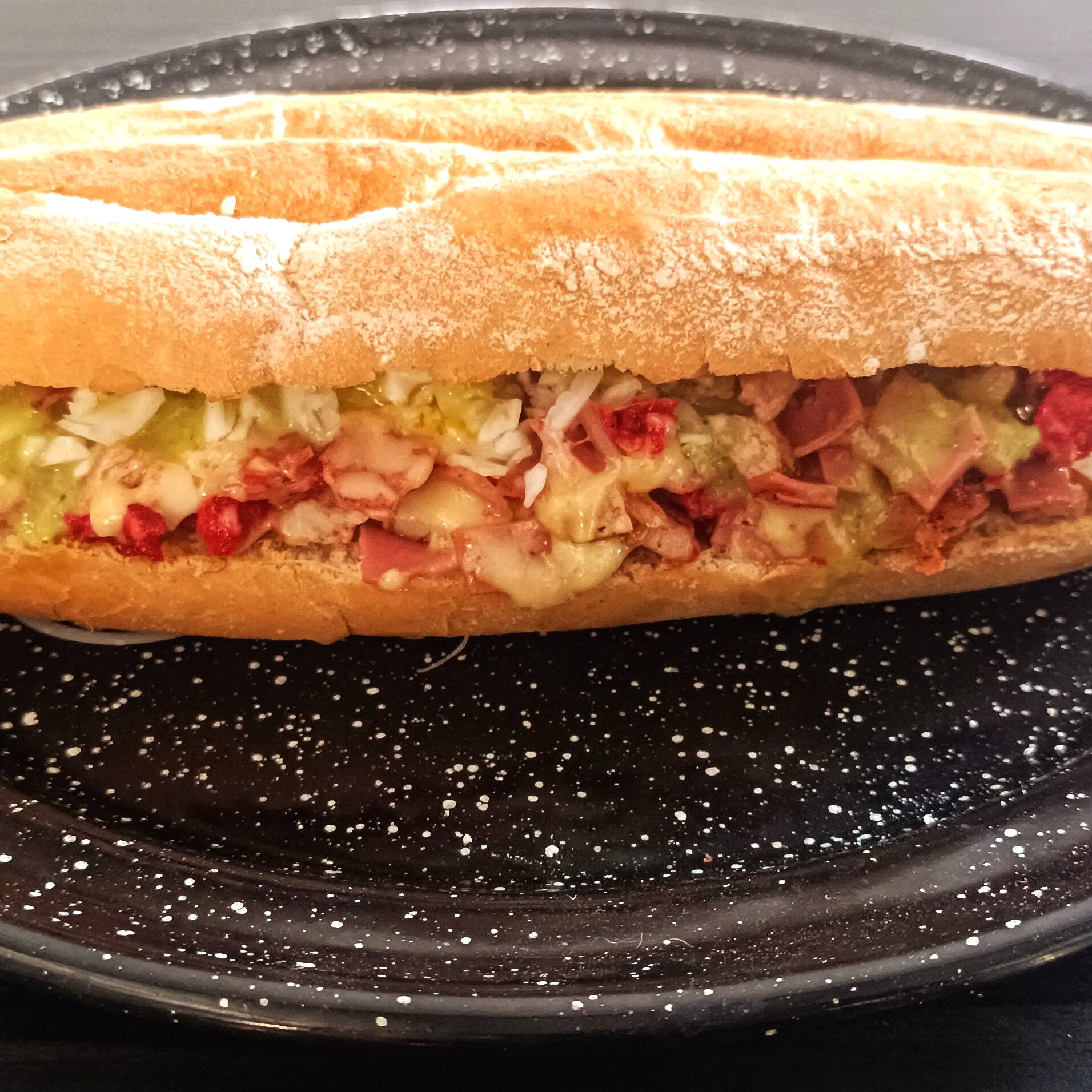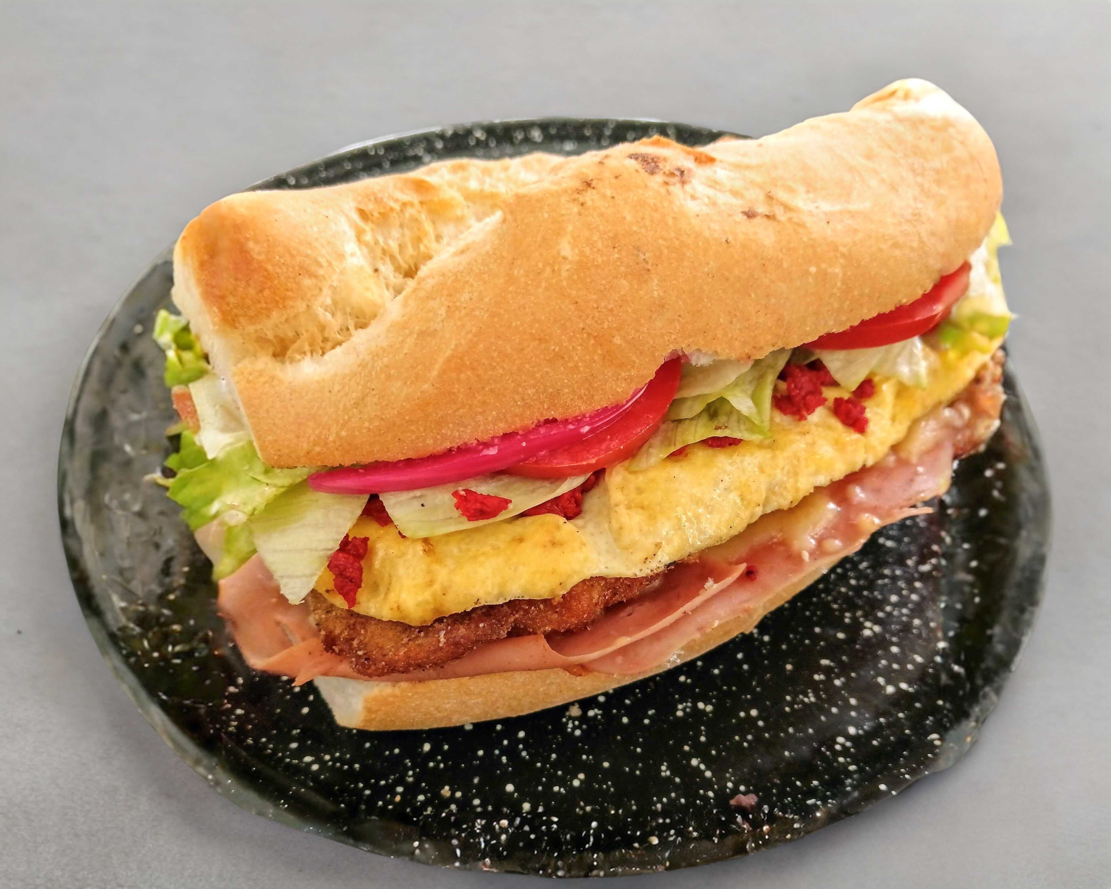 Milanesa Empanizada con frijol, mayonesa, jamón, queso gratinado, cebolla curtida, lechuga y tomate.