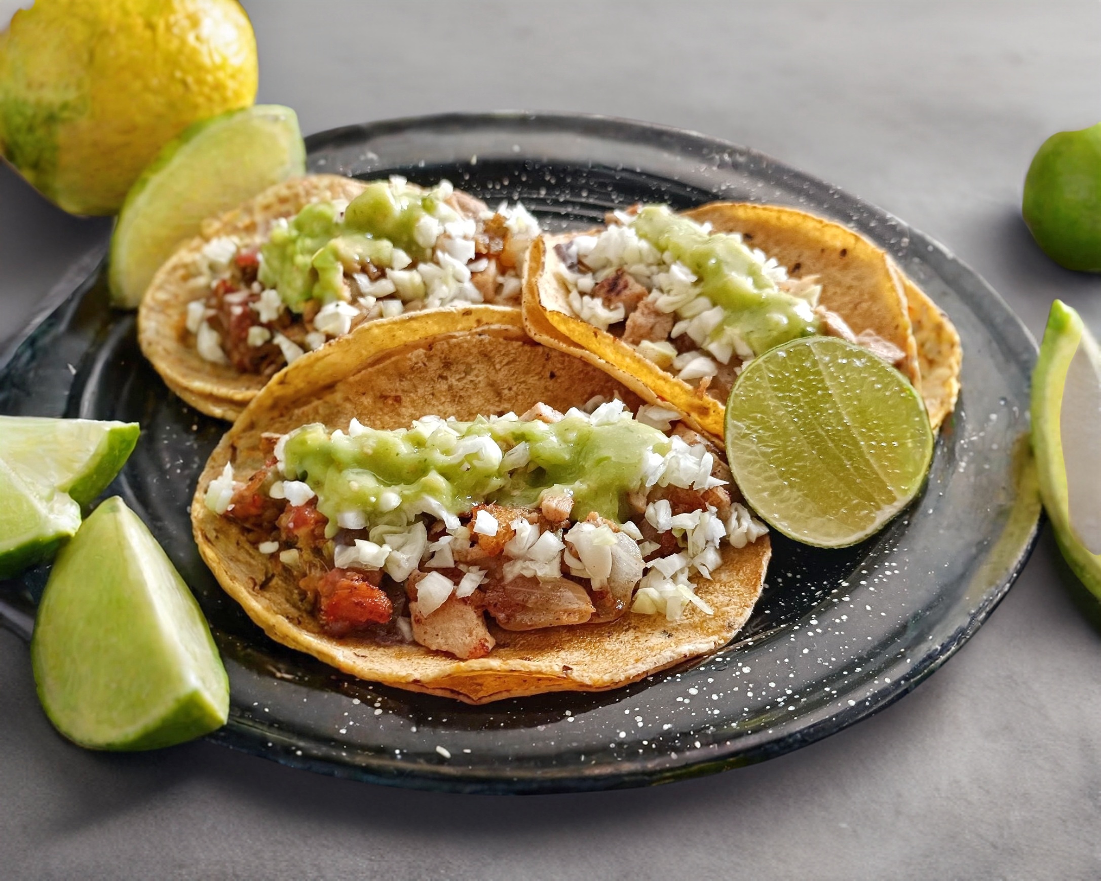 Taco de carne asada de puerco, con cebolla asada, frijol y salsa guacamolada. Elige la tortilla de maíz o harina.
