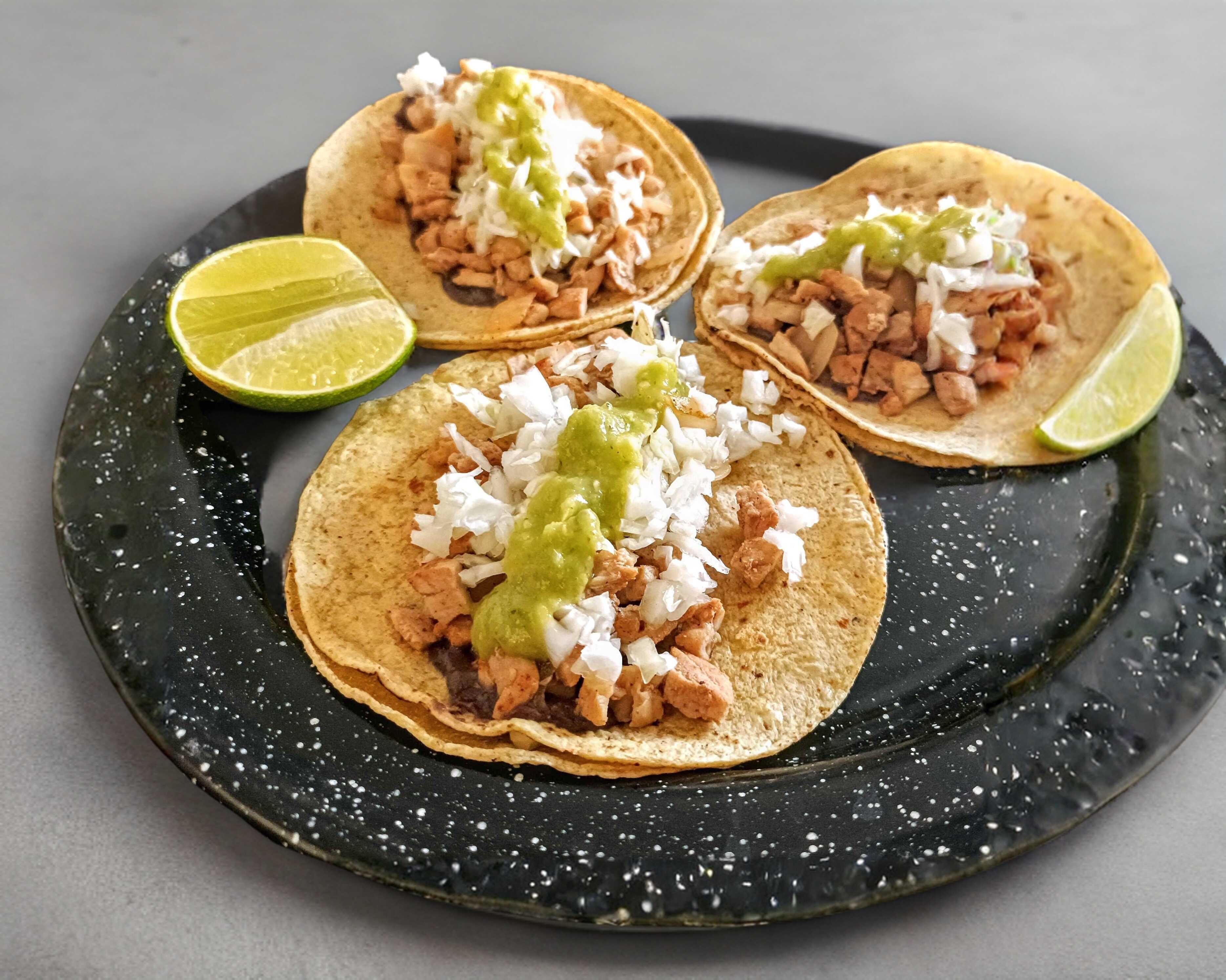 Taco de kastakán con frijol, repollo, cebolla asada y salsa guacamolada. Tortilla a elección.