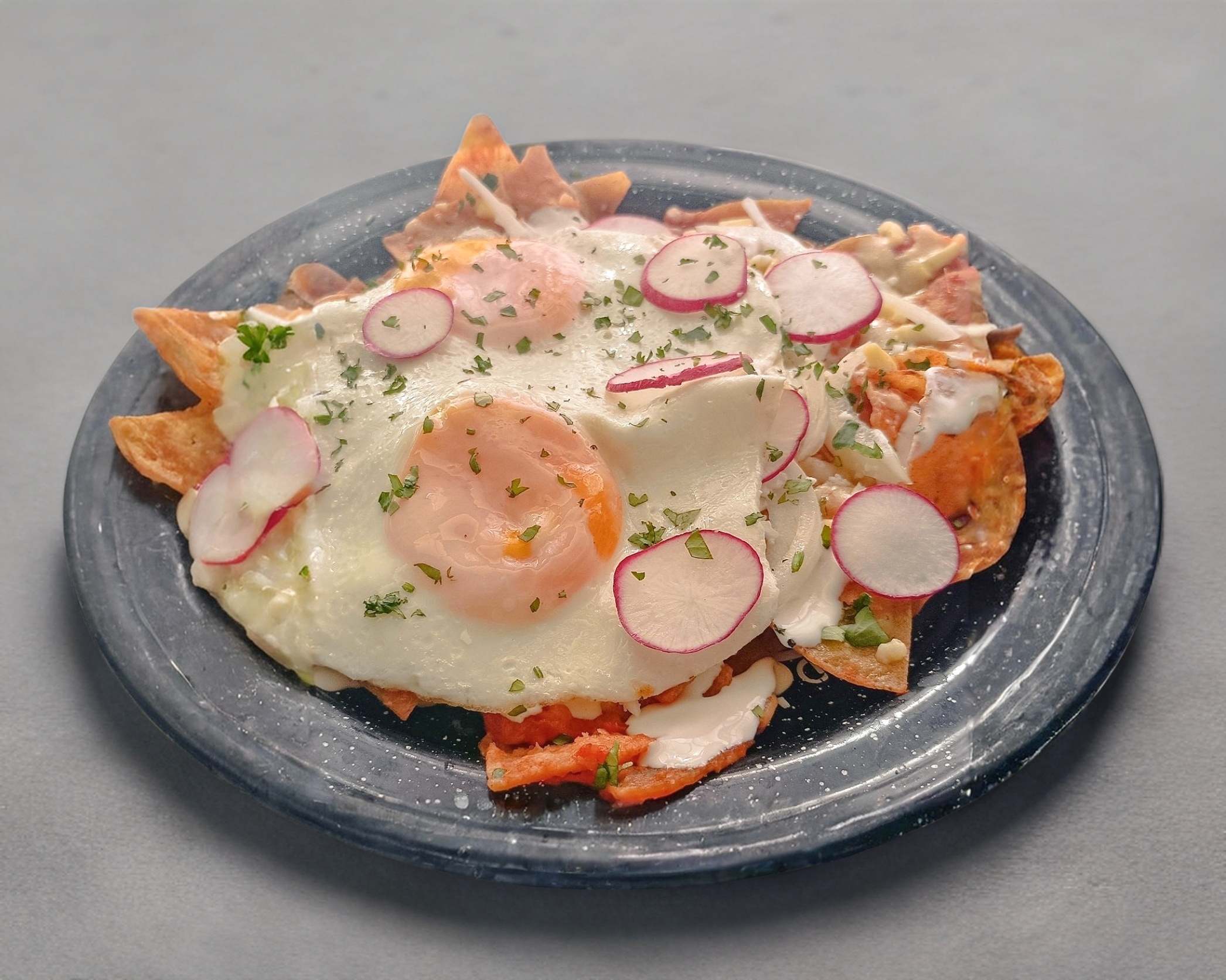 Órden de totopos con 2 piezas de huevos estrellados, salsa de tú elección, con queso gouda gratinado, cebolla curtida, rábano, crema y queso fresco.
