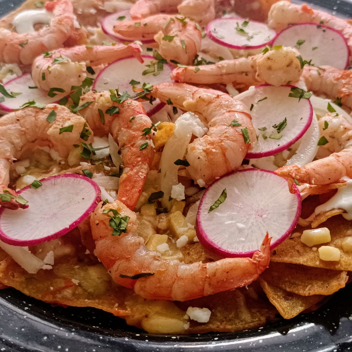 Órden de totopos con Camarones salteado con ajo y mantequilla con salsa de tú elección con queso gouda gratinado, cebolla curtida, rábano, crema y queso fresco.