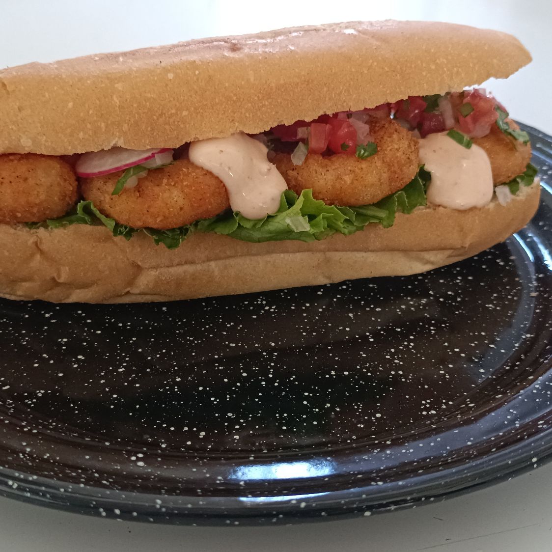 Torta de camarones empanizados, acompañados de lechuga, rábano, pico de gallo y mayonesa de chiles secos.