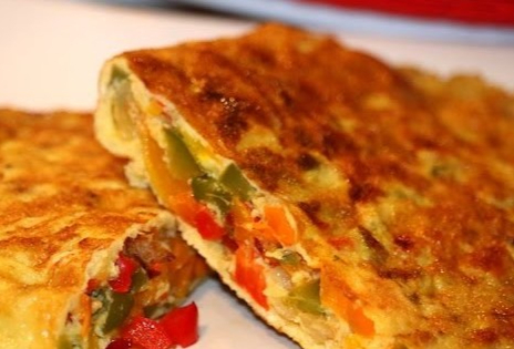 Omelette relleno de verduras salteadas y queso. Acompañado de una fresca ensalada o frijol.