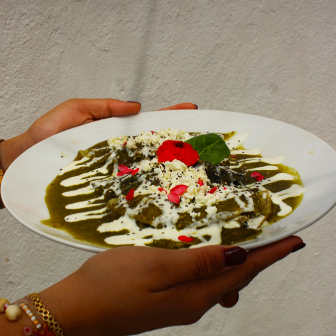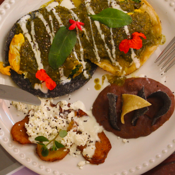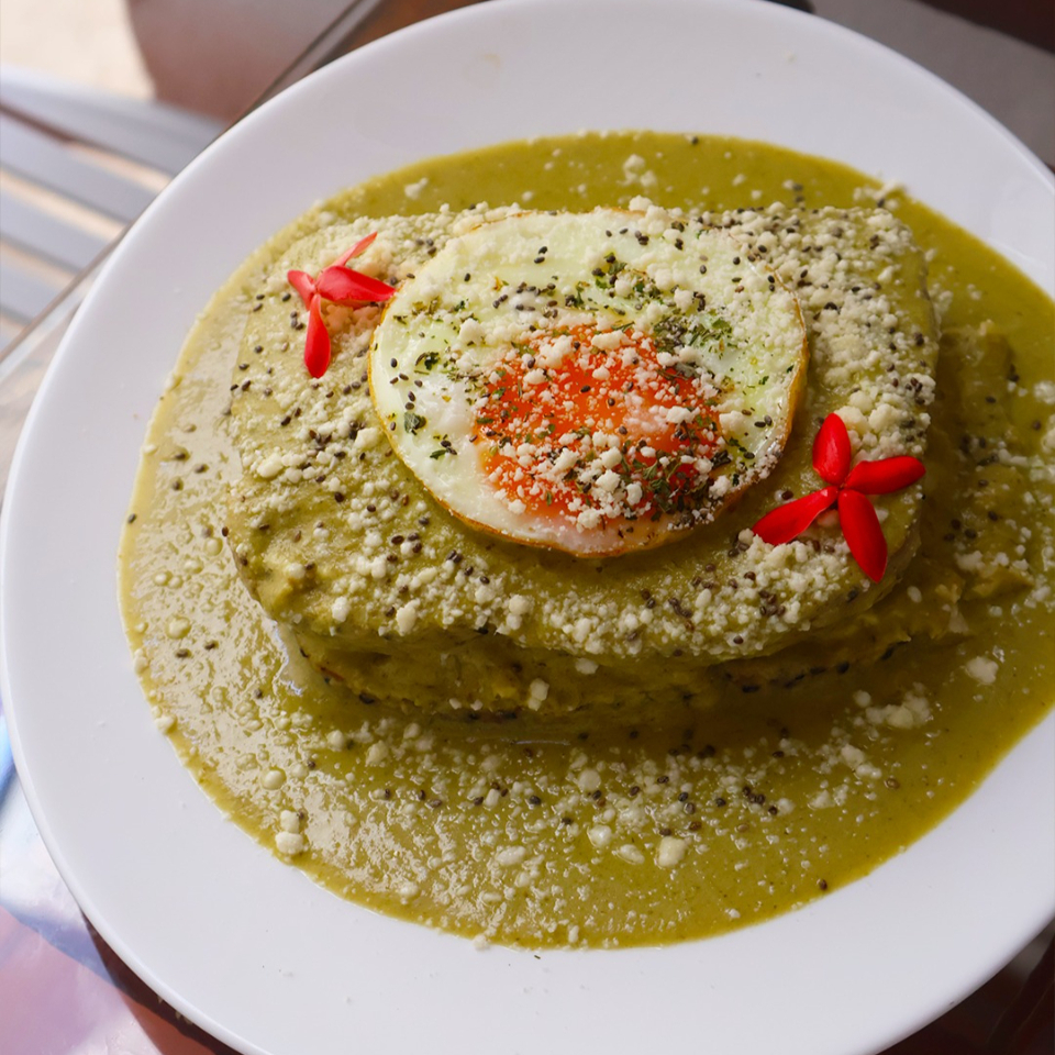 Huevos revueltos con chaya y queso Oaxaca montados sobre dos tortillas fritas, bañados en salsa verde, acompañados con plátanos fritos y frijoles.