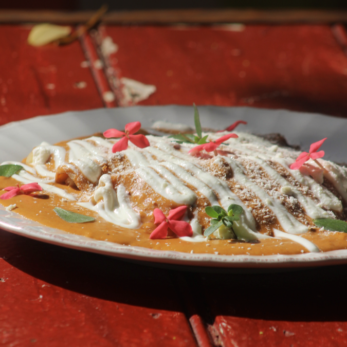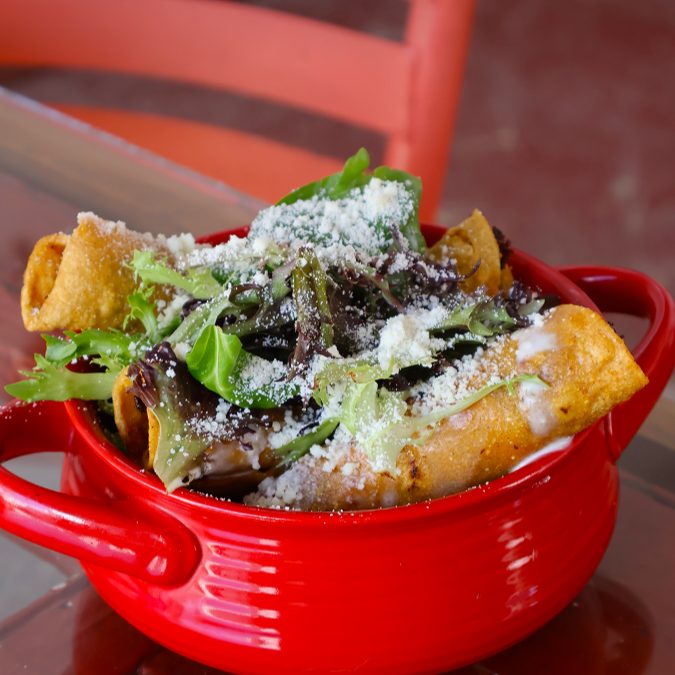 Tres tortillas rellenas de pollo, acompañadas con crema y queso. Salsas: Frijol, Roja o Verde.