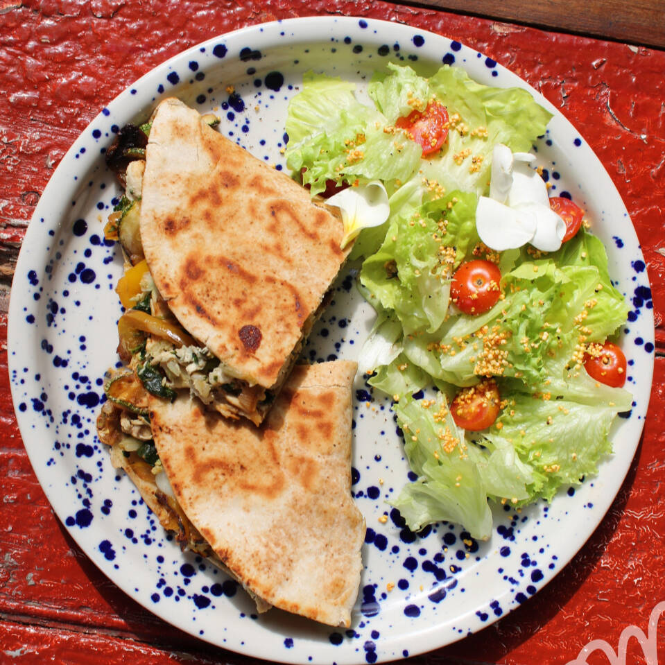 Pan pita relleno de verduras salteadas con pollo y queso Oaxaca, acompañado de ensalada.