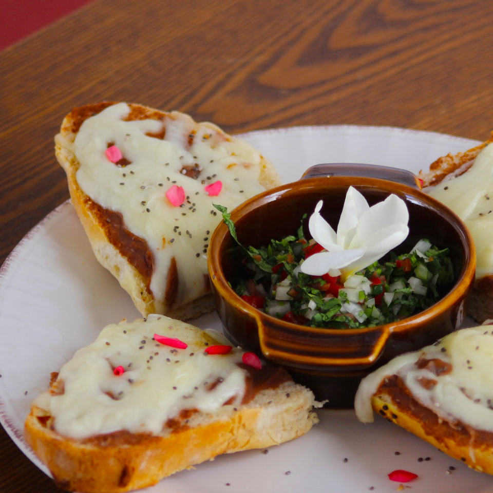 Con frijoles refritos, queso Oaxaca y pico de gallo. Media orden (2 piezas).