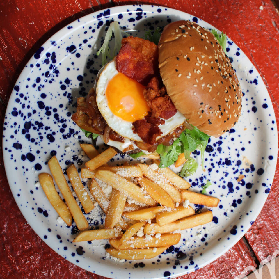 Carne de res, huevo estrellado o revuelto, tocino y cebolla caramelizada con papas fritas.