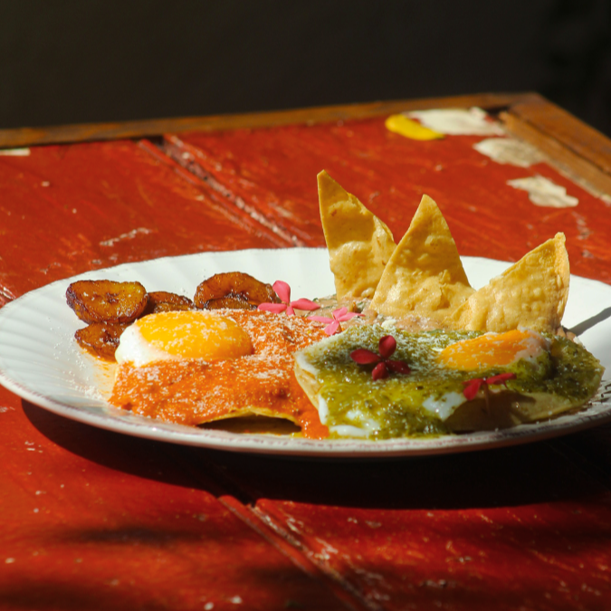 Dos huevos estrellados sobre tortillas fritas, bañados en salsas verde y roja. Acompañados de frijoles y plátanos fritos.