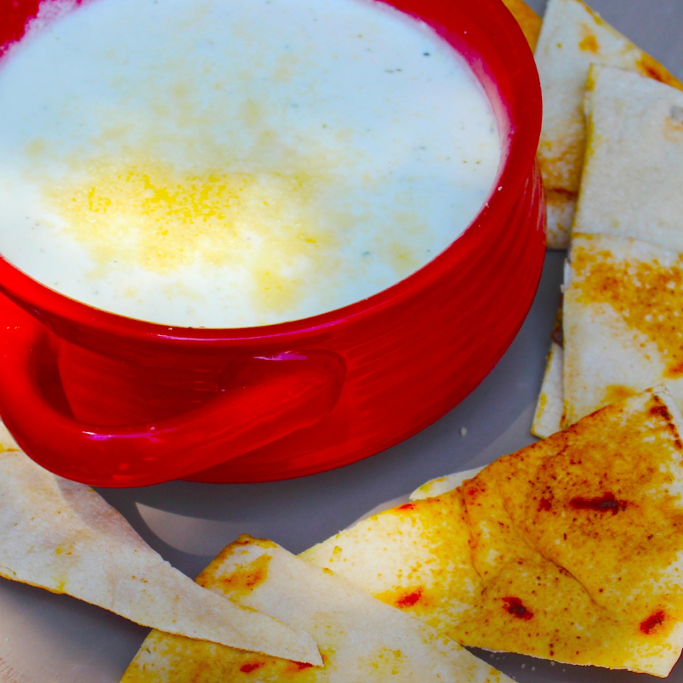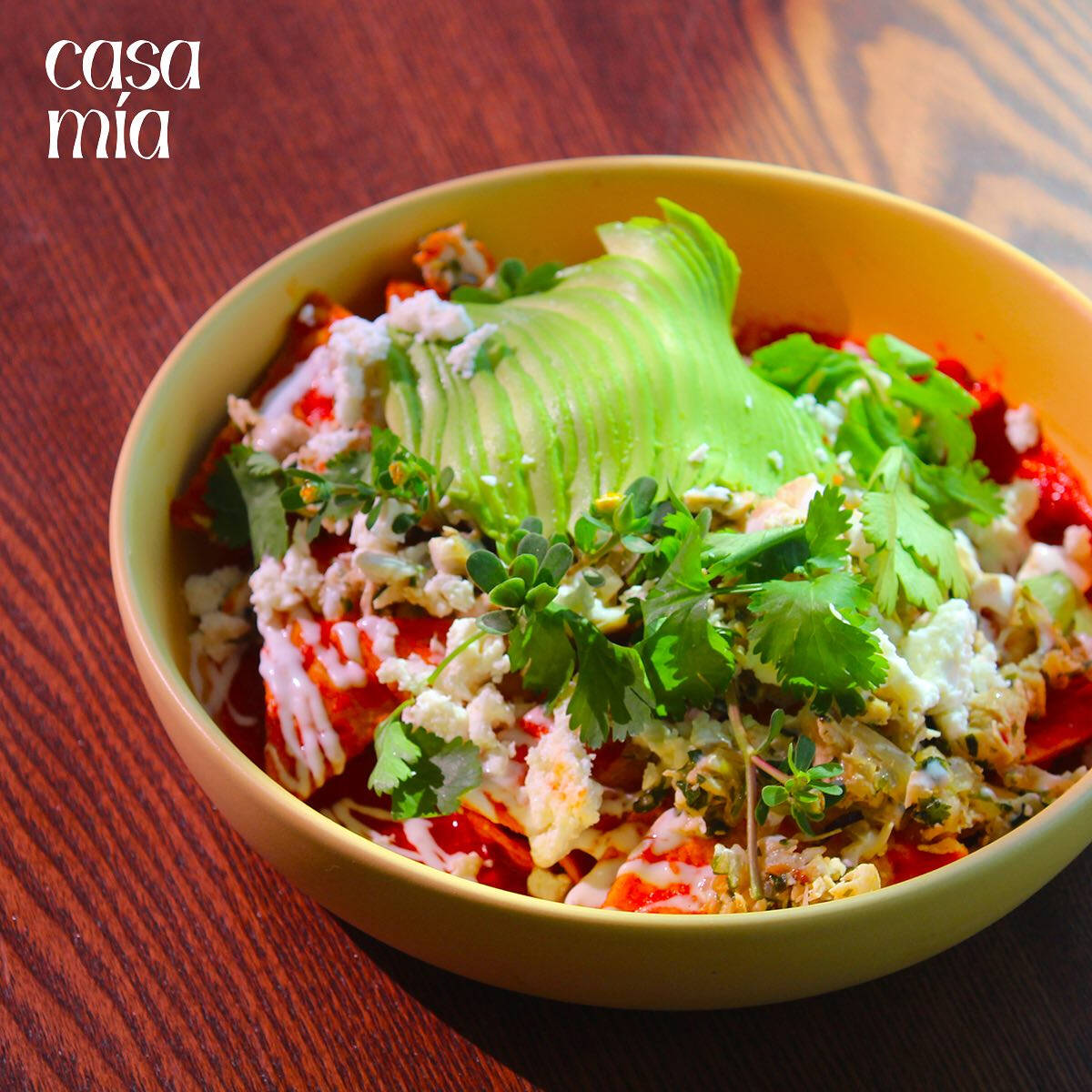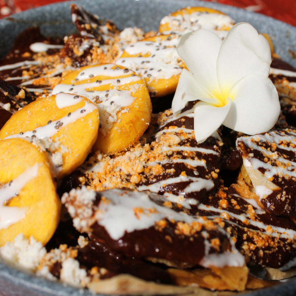 Totopos dorados bañados en mole o salsa de suizas, con crema y queso.