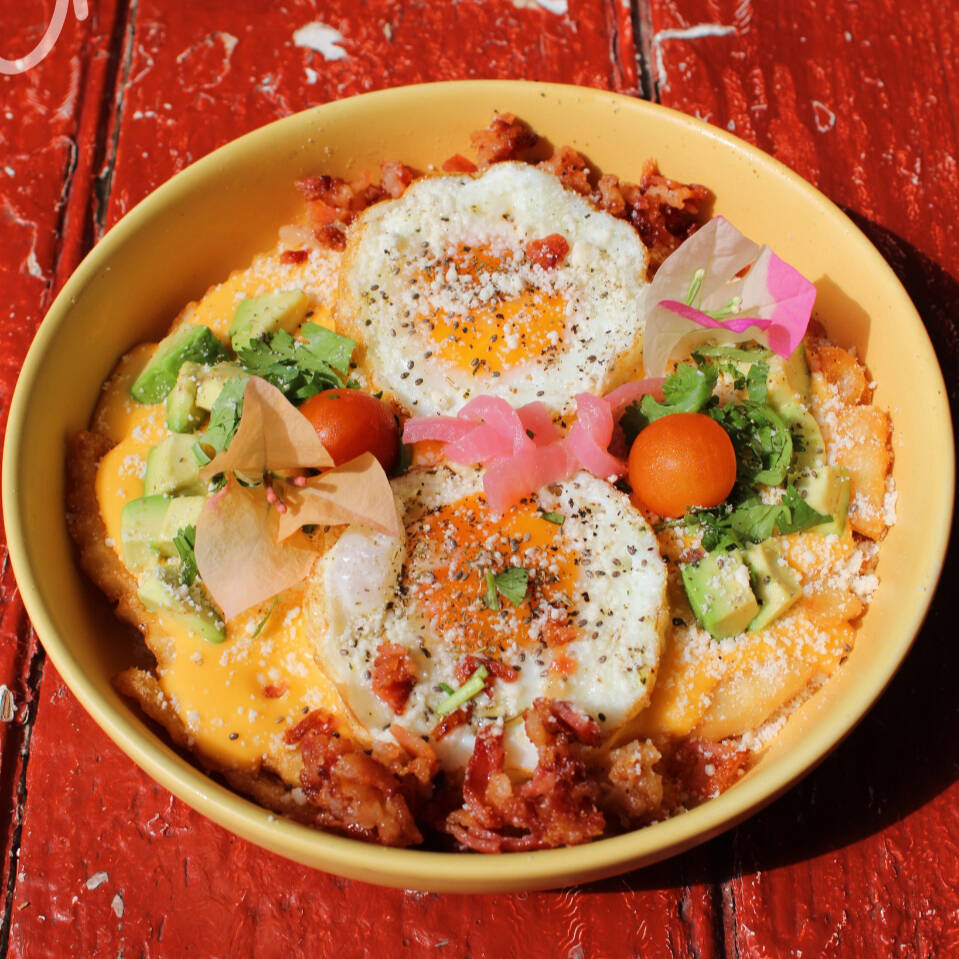 Dos huevos estrellados a tu gusto, sobre una cama de papas a la francesa, queso cheddar y cilantro.