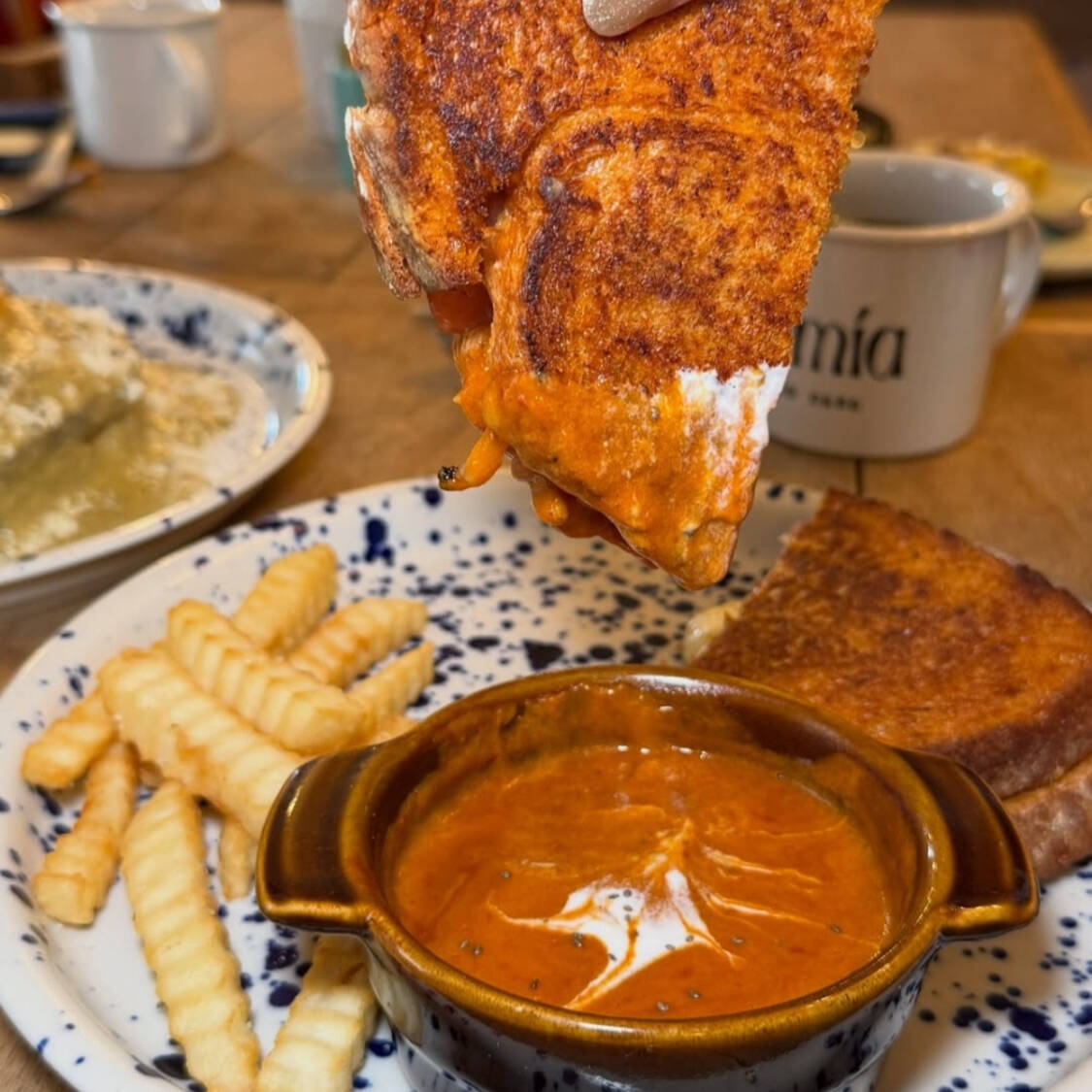 Pan de masa madre, mezcla de quesos, tocino crujiente, dip de chipotle y papas a la francesa.