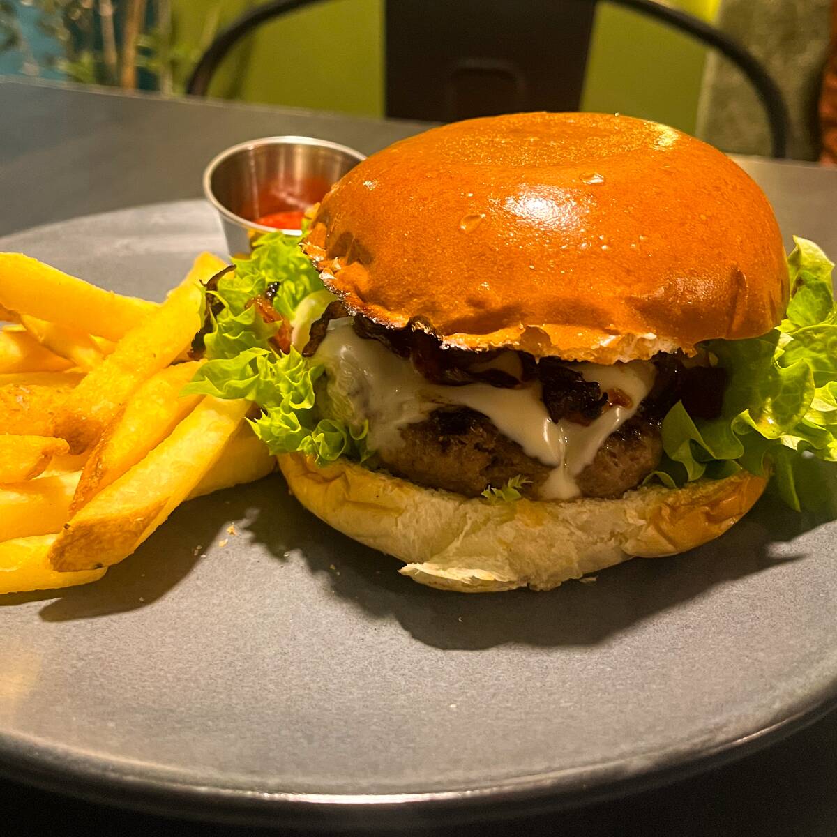 Pan brioche, carne de res, queso suizo, mermelada de tocino y lechuga. Con papas a la francesa.