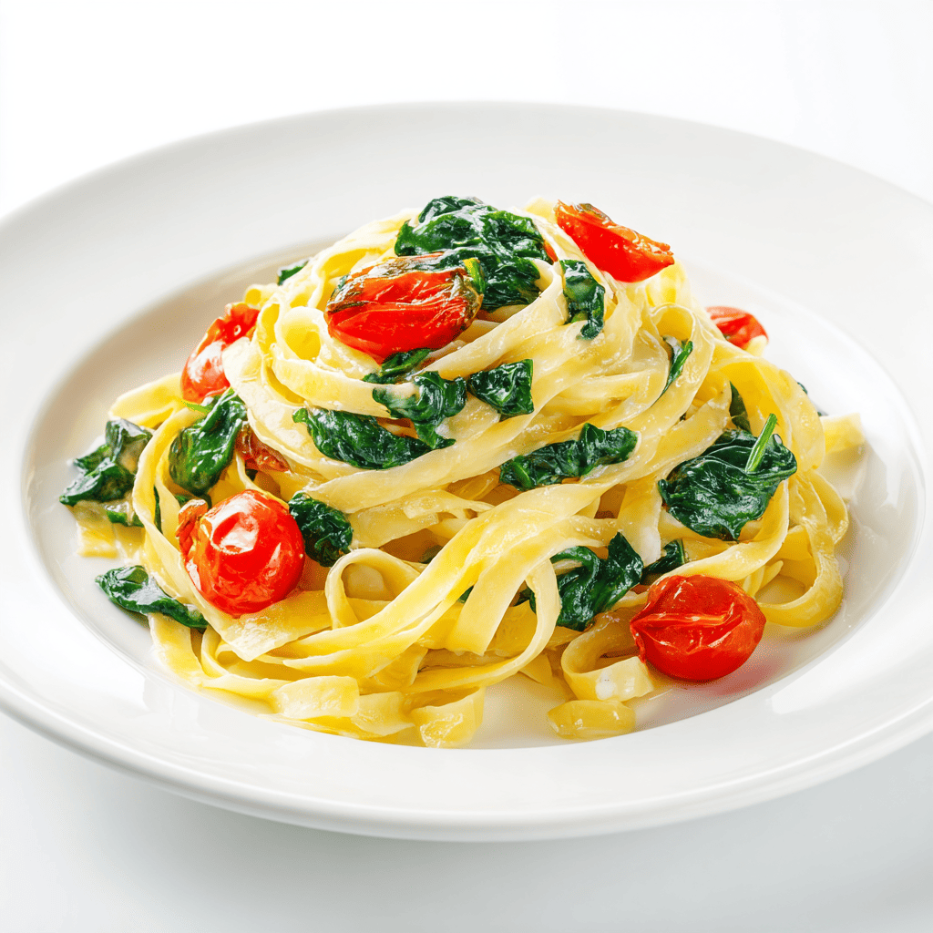 Pasta a la mantequilla, salteada con tomate cherry y espinacas. Con panecito y parmesano.