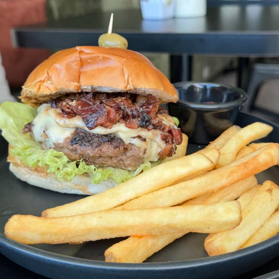Pan brioche, carne de res bañada en salsa BBQ, tocino, queso suizo, lechuga y cebolla morada. Con papas a la francesa.