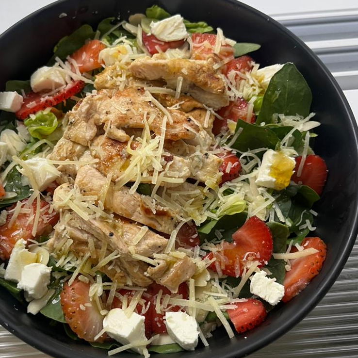 Mix de lechugas con trocitos de fresa, almendras fileteadas, pollo a la plancha, queso cabra y vinagreta.