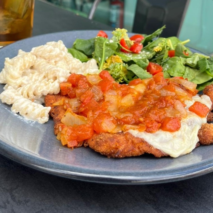 Pechuga empanizada, queso gratinado y salsa de tomate. Acompañada de tortillas y 2 guarniciones a elegir.