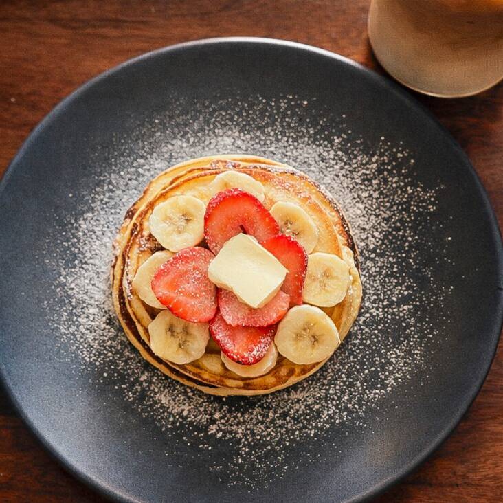 Servidos con fresas y plátano. Con miel y mantequilla.