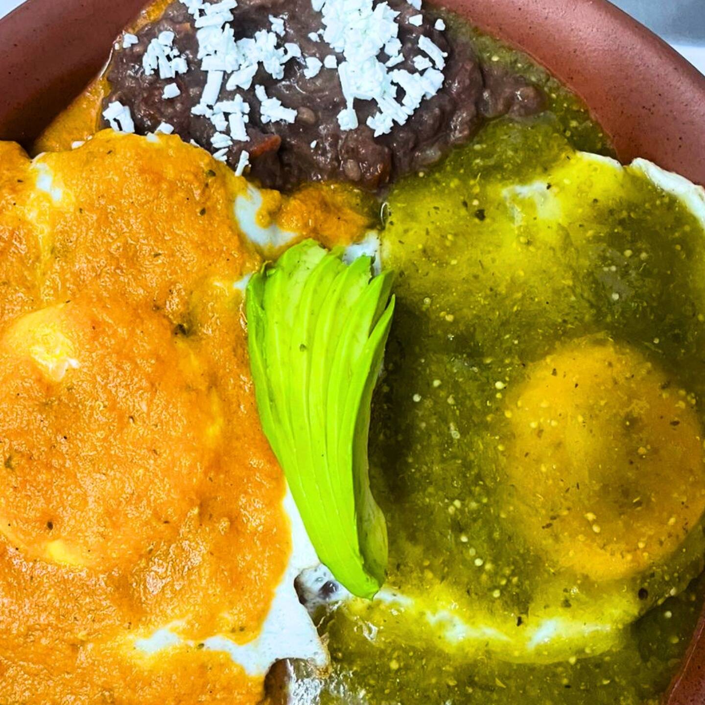 Huevos estrellados sobre tostadas, uno bañado en salsa verde y el otro en salsa roja. Con frijoles refritos.