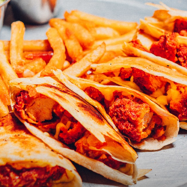 Quesadilla de pollo crispy bañada en salsa búfalo. Con papas a la francesa o ensalada de espinaca y tomate cherry.