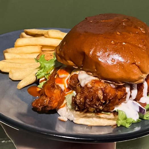 Pan brioche, con tiras crispy bañadas en búfalo-ranch y vegetales. Con papas a la francesa.
