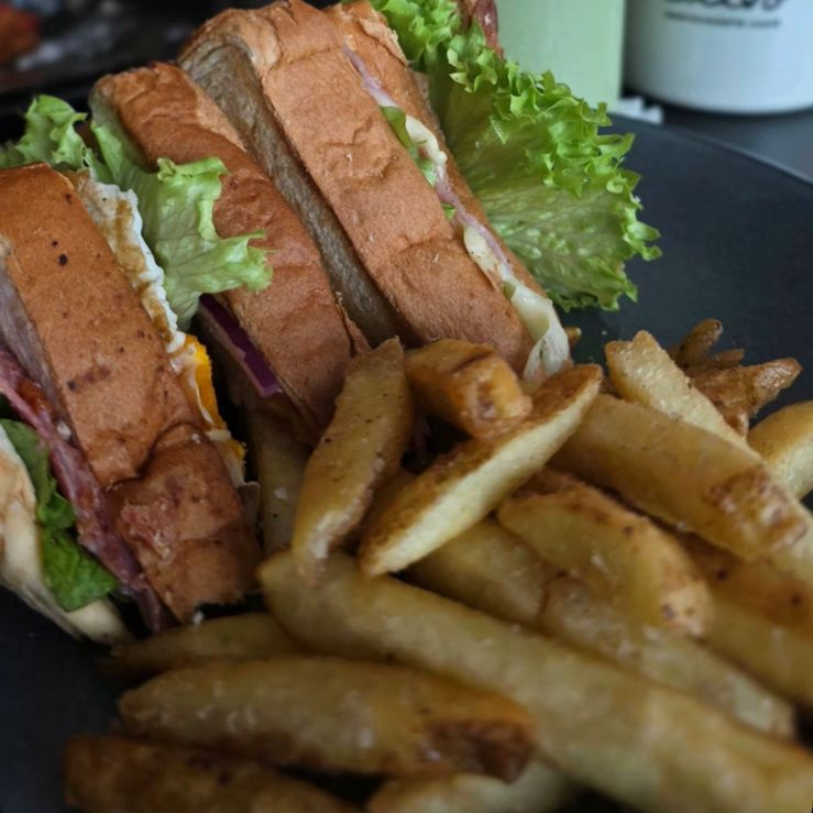 Pan, mayonesa, lechuga, jamón, queso, huevo estrellado, pechuga a la plancha y vegetales. Acompañado con papas a la francesa.