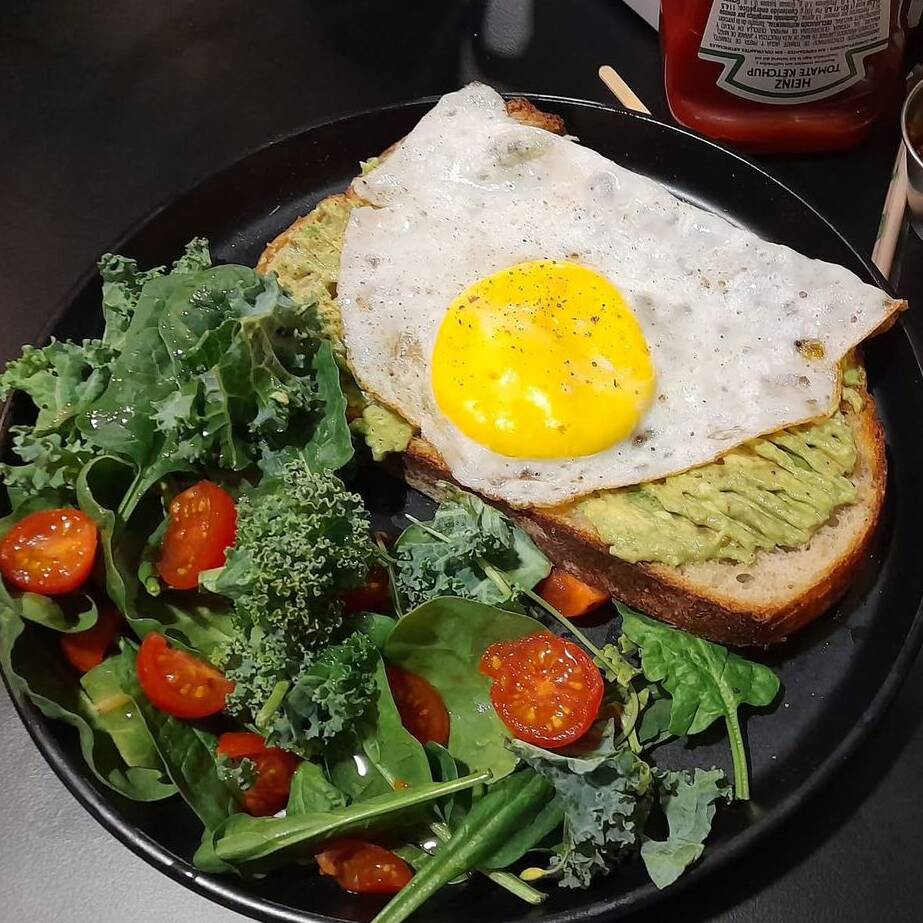Pan de hogaza, aguacate y huevo al gusto (estrellado o revuelto). Con ensalada de espinaca y tomate cherry.
