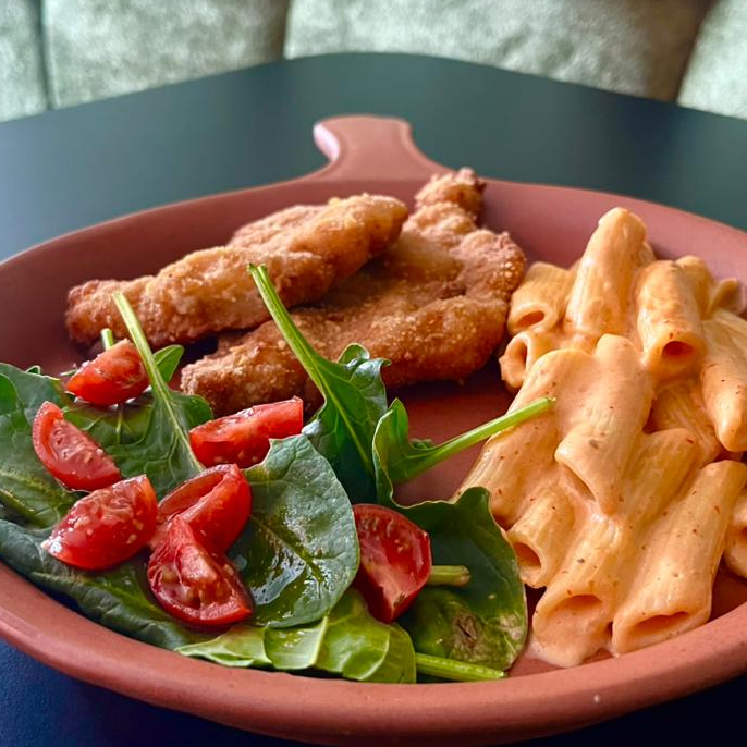 Pechuga de pollo con empanizado crujiente. Acompañada de tortillas y 2 guarniciones a elegir.
