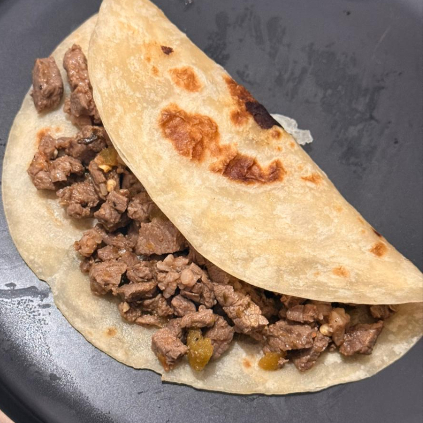 Carne de diezmillo bien sazonada a la plancha en tortilla de harina de Sonora de 20 cm, acompañada de salsas caseras.