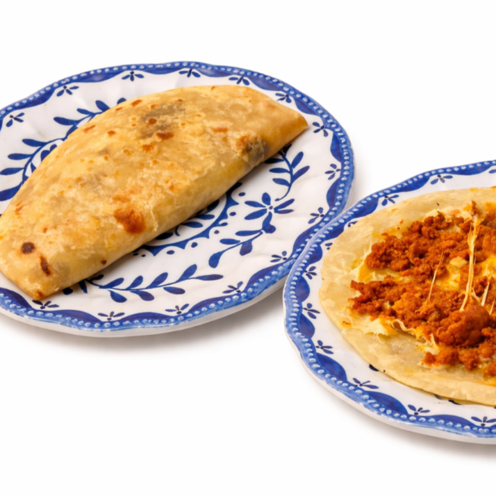 Doble tortilla de sonora rellena de queso y carne adobada, acompañada de salsas caseras