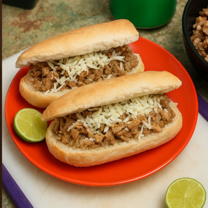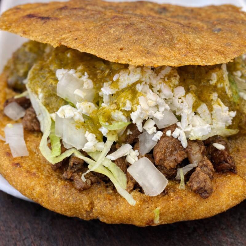 Carne asada, repollo, frijol, cebolla asada, jamón y queso