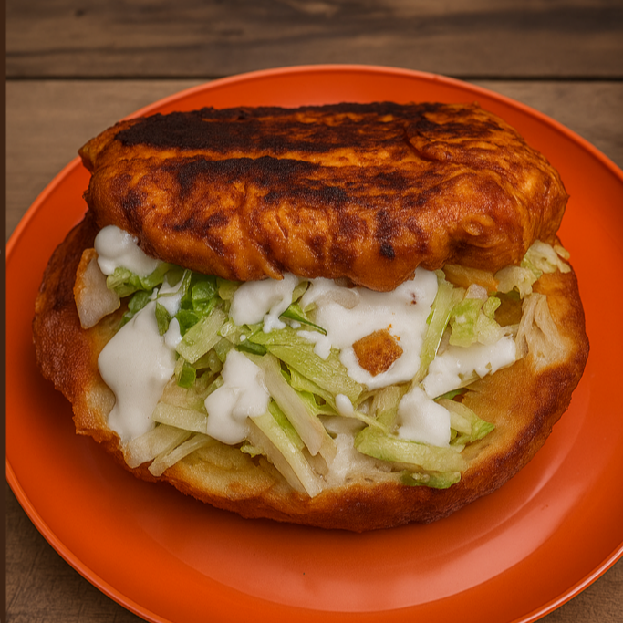 Chicharrón prensado, lechuga, cebolla, crema y queso