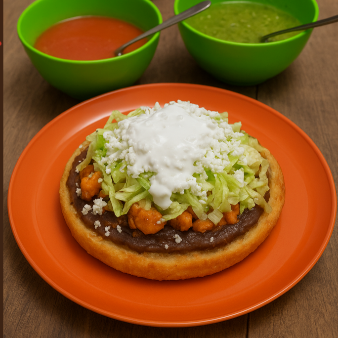Frijol, lechuga, crema, queso y un guiso a escoger