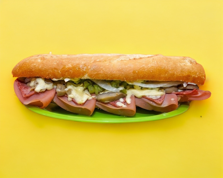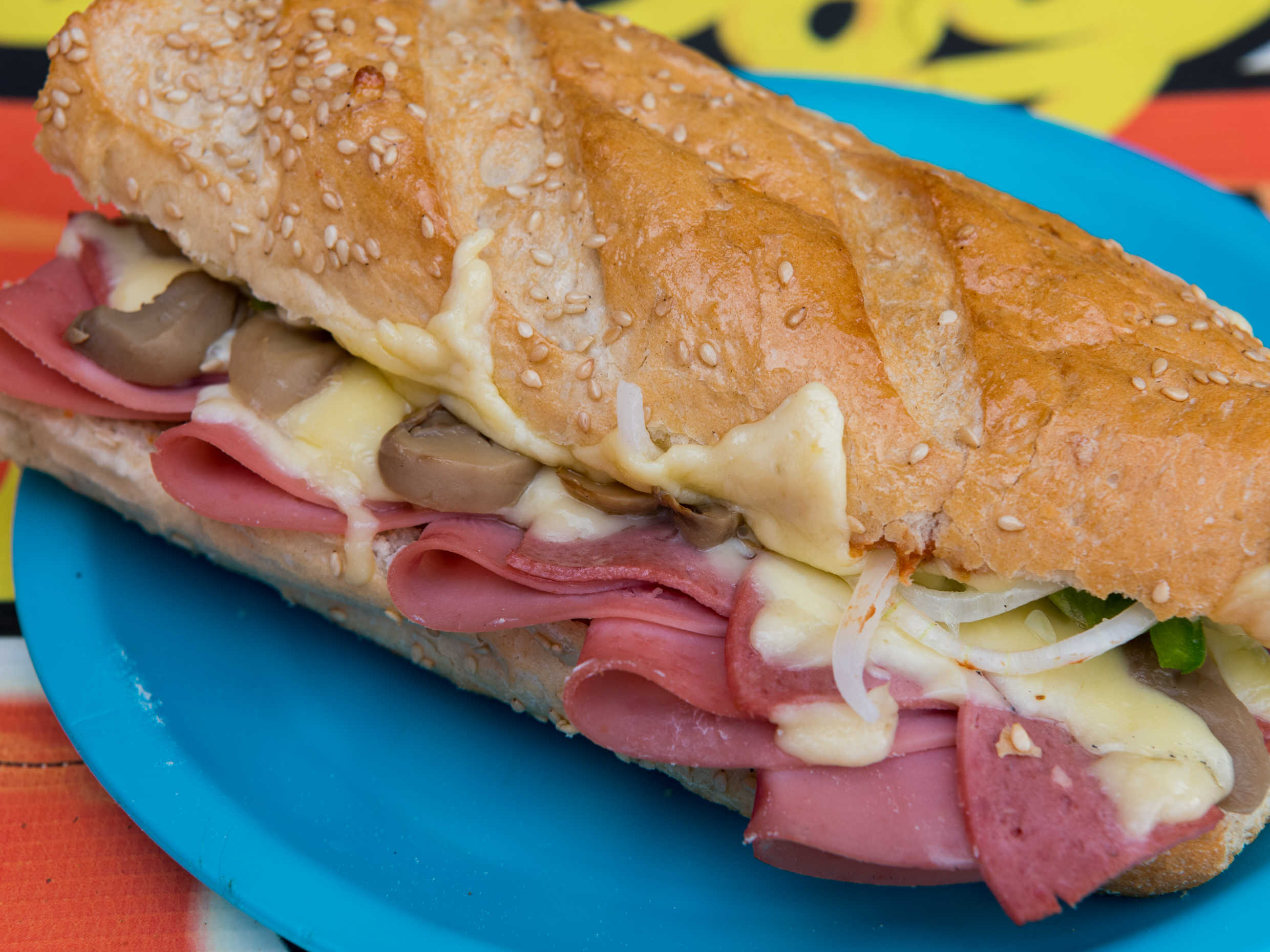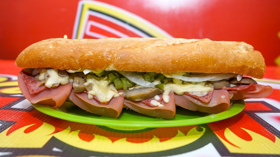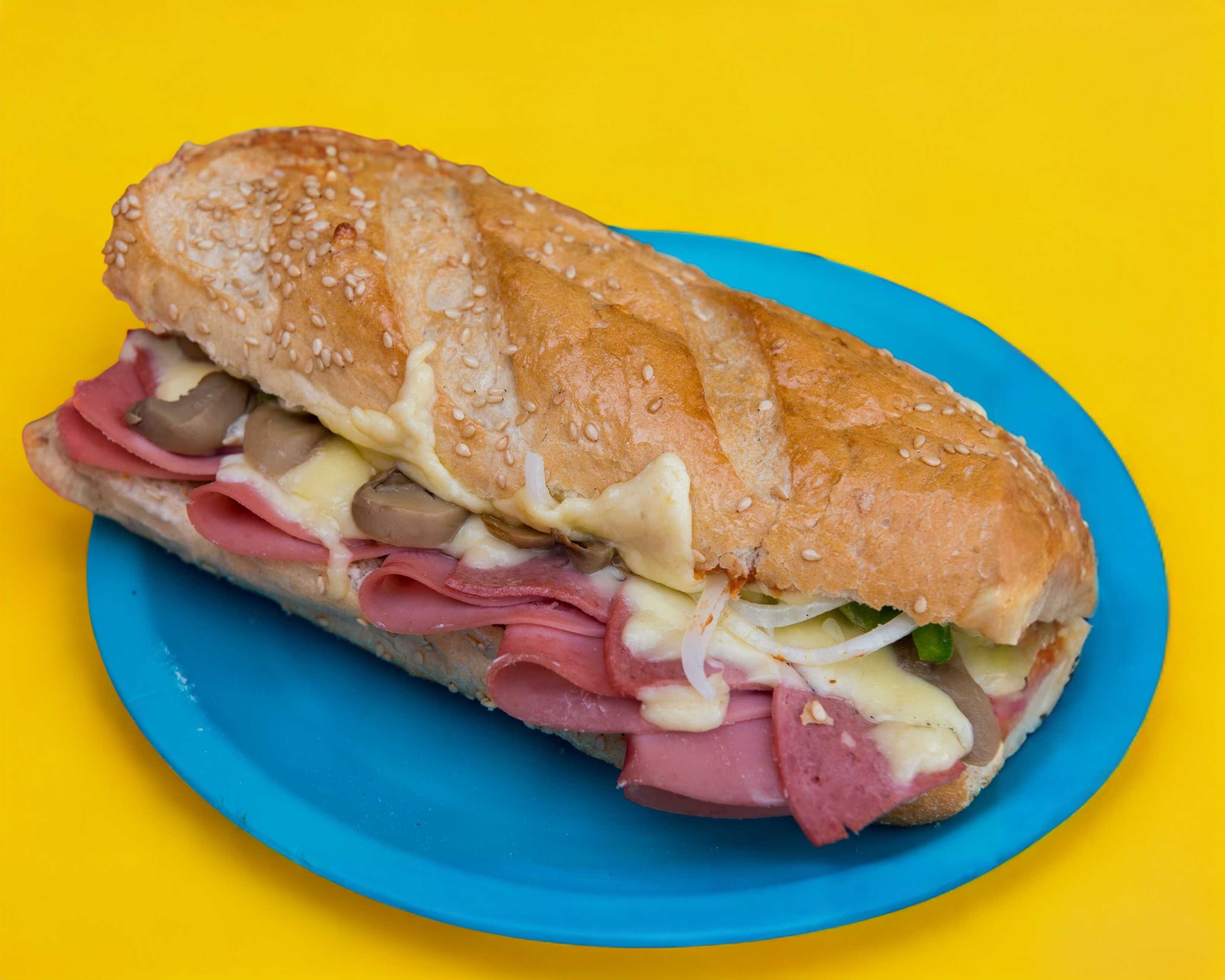 Dos bolillos con jamón, salami, champiñón, pimiento,cebolla y queso.