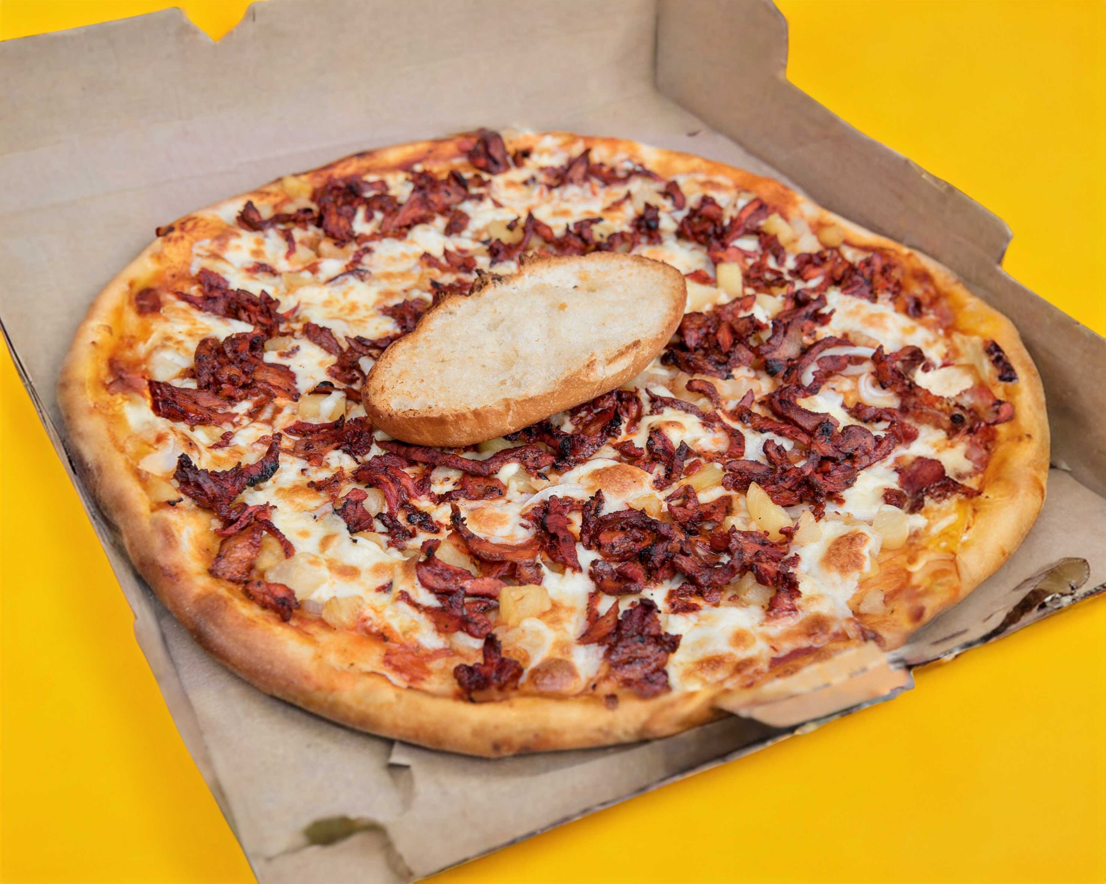 Pizza gde de 12 pzs con carne al pastor, piña y cebolla, pan con ajo y salsas.