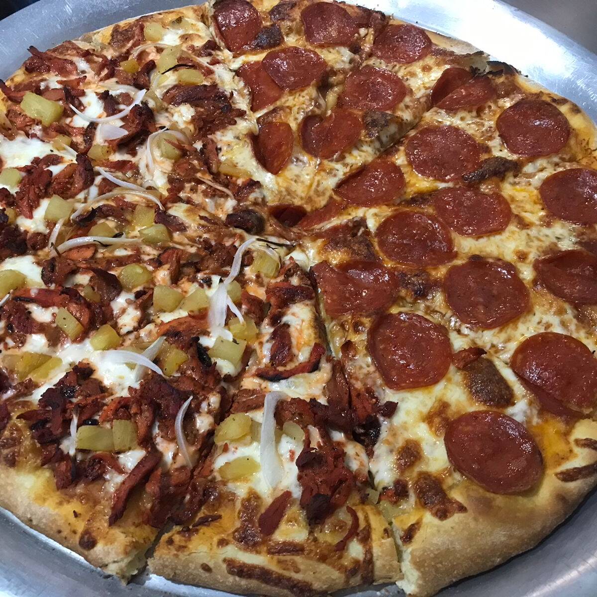 Pizza gde de 12 piezas, dividida en las pizzas mas pedidas, 1/2 peperoni con queso y 1/2 pastor , con piña y cebolla.