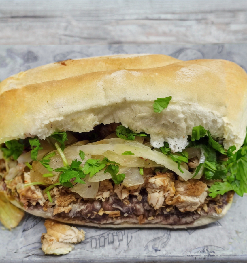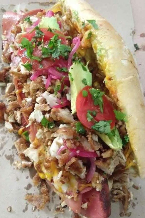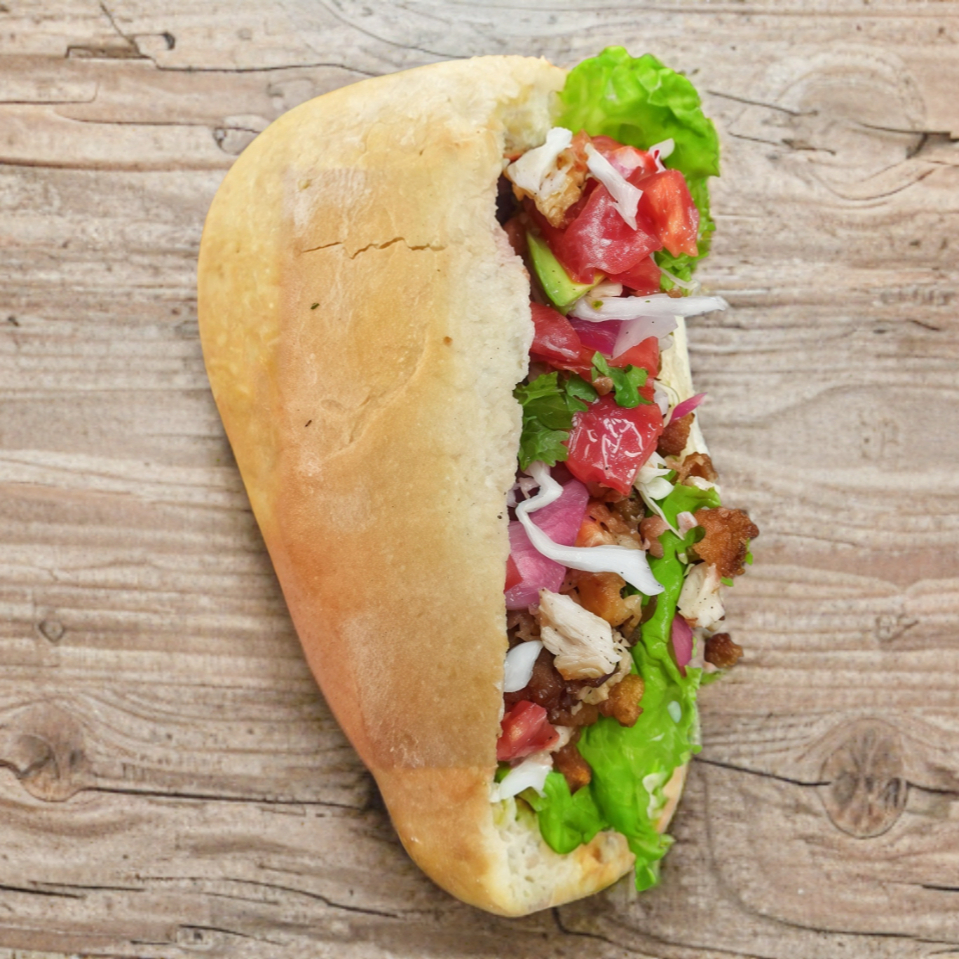 Torta de pechuga de pollo con jamón, queso, lechuga,cebolla y tomate