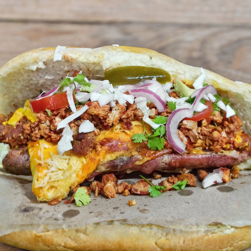 Barrita a la leña, mayonesa, lechuga, cebolla encurtida y tomate.