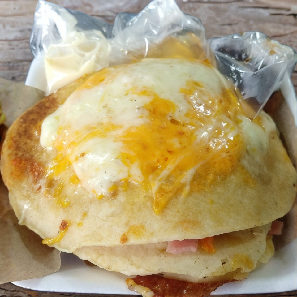 Platillo personal, el cual incluye: Hot Cakes Con Jamón y Queso (3 Piezas)