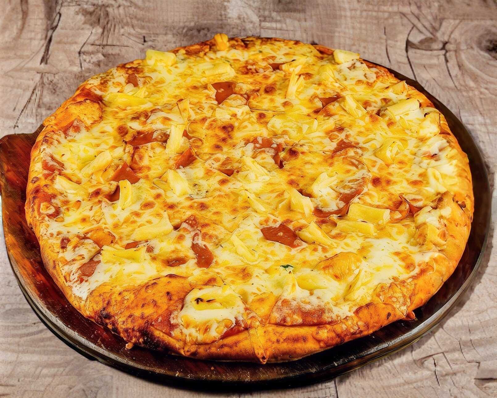 Pizza con triple queso con tus 3 ingredientes favoritos, acompañado de nuestro delicioso pan con ajo y queso.