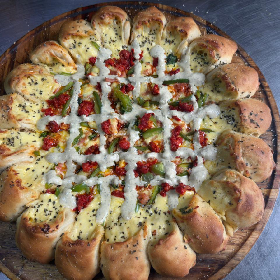 Pizza grande dedos Bites rellenos de mancho, con base de Queso, Pimiento verde, Chorizo, Tocino, Espinaca y un toque especial de Ranch Xcatic